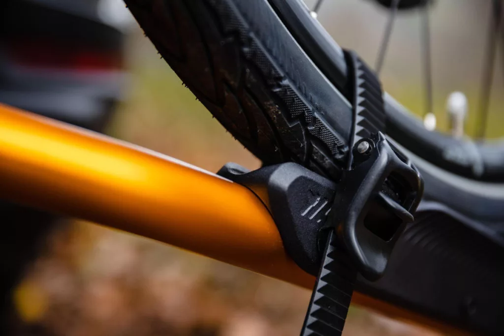 - Možnosť uzamknúť bicykle k nosiču pomocou pogumovaného oceľového lanka, ktoré sa zaistí uzamykateľnou skrutkou. Vďaka konštrukcii nosiča nie je technicky možné sňať nosič z ťažného zariadenia, pokiaľ je na ňom aspoň jedno koleso. Po sňatí kolies nie je nosič nijako zaistený, preto odporúčame prázdny nosič jednoducho zložiť do kufra auta.